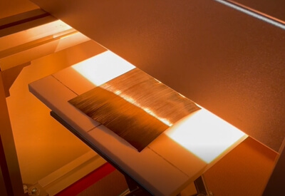 朗普技術(shù)方案:在待折彎的熱塑性預(yù)浸料板上進(jìn)行紅外線快速預(yù)熱軟化,雙面加熱,以達(dá)到折彎所需工藝要求。利用線型聚焦加熱器(加熱器聚集成一條高溫加熱線)的低能耗,高光強(qiáng),穿透力強(qiáng),控制簡(jiǎn)單等特點(diǎn),通過(guò)上下布置,快速精準(zhǔn)軟化所需的狹長(zhǎng)區(qū)域,尤其帶有厚度的預(yù)浸料折彎加工。